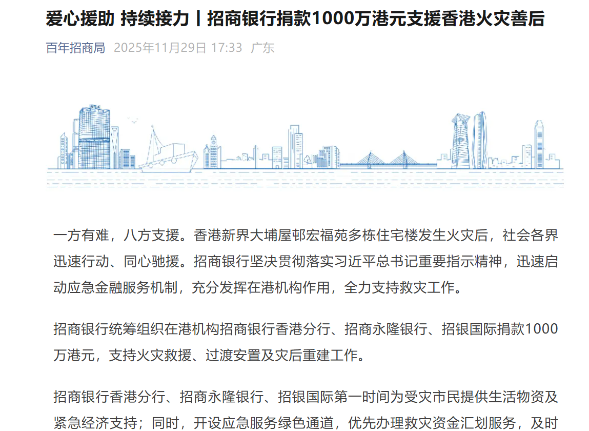 11月29日,招商银行发布公告称,香港新界大埔屋邨宏福苑多栋住宅楼发生火灾后,社会各界迅速行动、同心驰援。迅速启动应急金融服务机制,充分发挥在港机构作用,全力支持救灾工作。